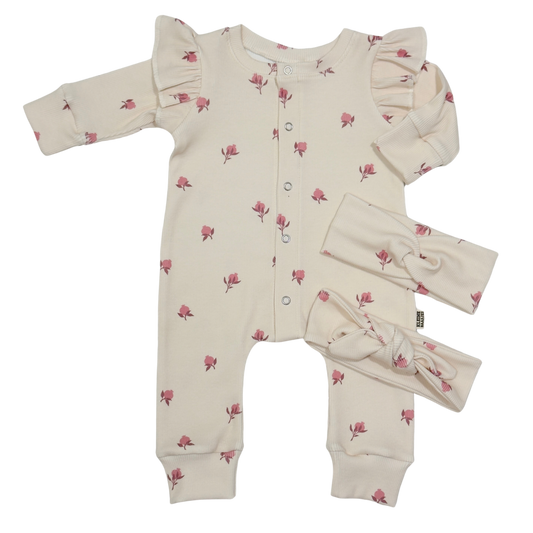 Baby Jumpsuit Rib Mini Bloemen Beige met Ruffles