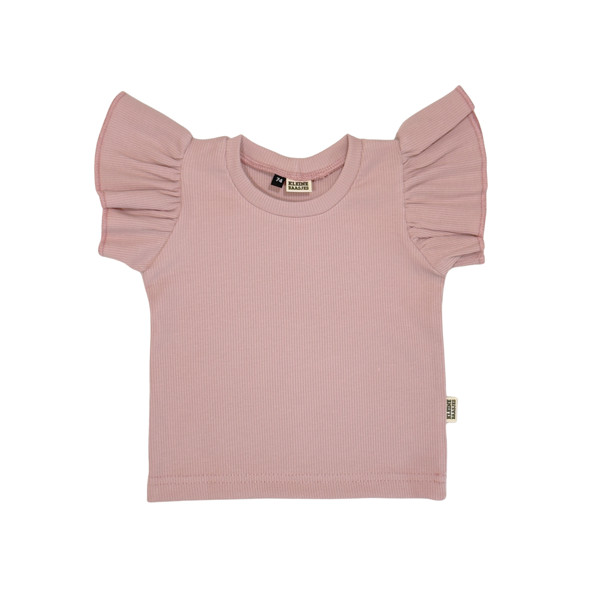 Heel mooie ruffle top met vrolijke ruffles aan de mouwtjes. Dit shirtje voor baby's en meisjes is van een mooie en zachte rib stof in de kleur oud roze.