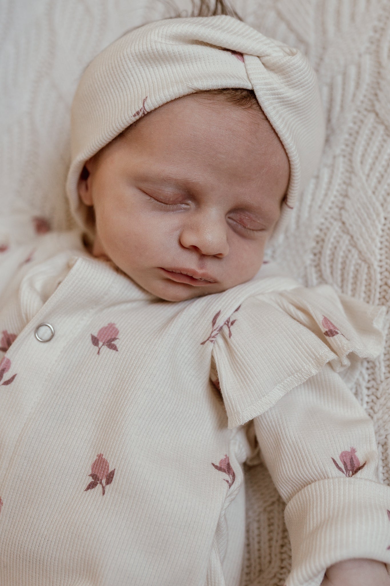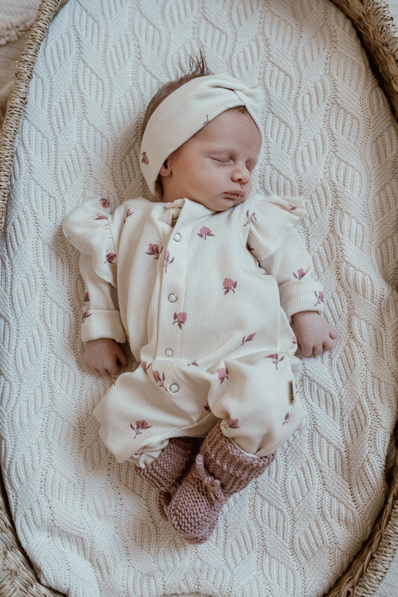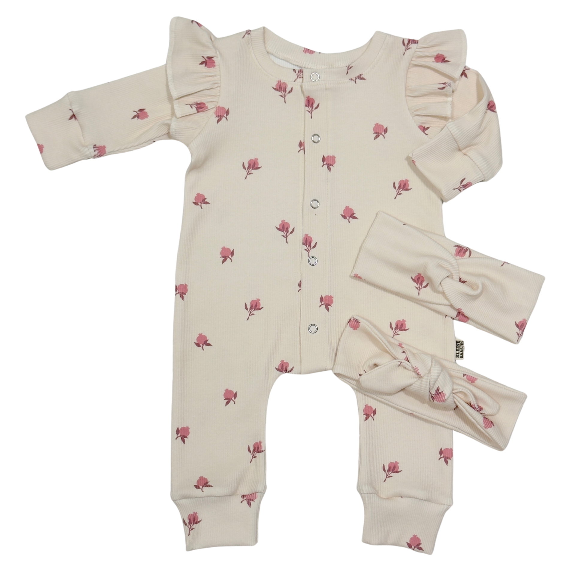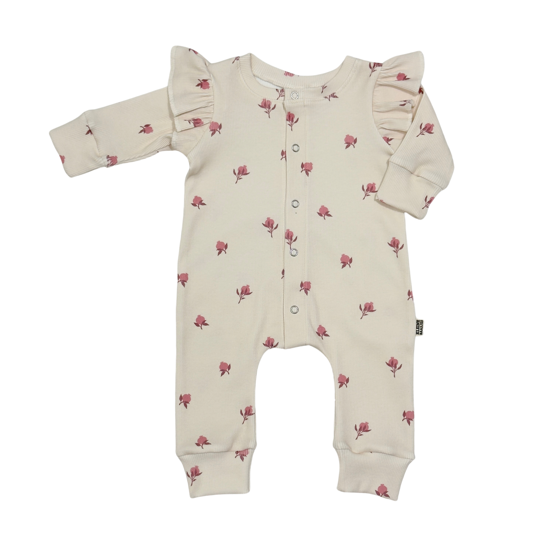 Mooie jumpsuit met ruffle mouwtjes van zachte ribstof met een lief printje van kleine granaatappeltjes in in roze tinten op een licht beige achtergrond.