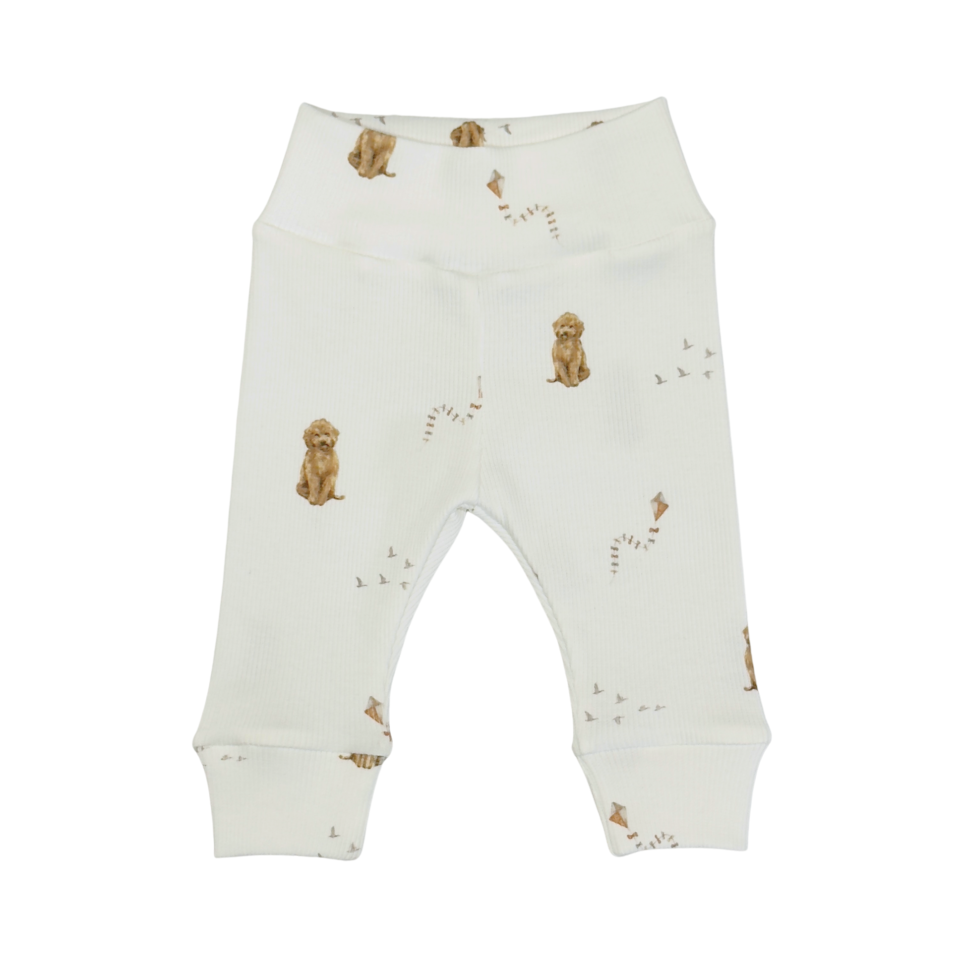 Fijn newborn broekje voor jongens en meisjes van een zachte rib jersey stof. Het baby broekje is creme/wit van kleur met een print van labradoodle hondjes en kleine vliegers en vogels.