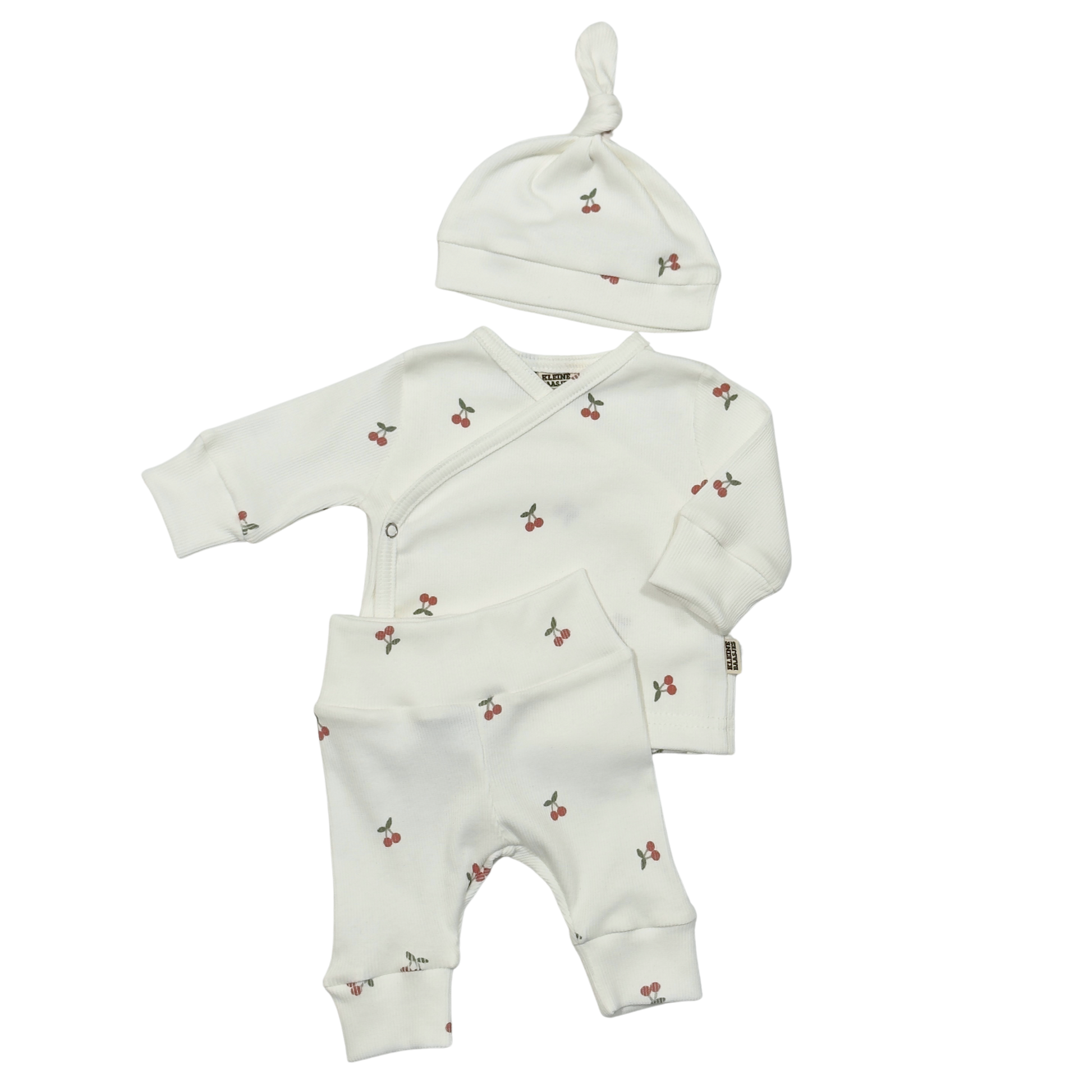 Combineer dit baby overslag vestje met kersjes met een broekje en mutsje of haarband in dezelfde print voor een complete newborn set.