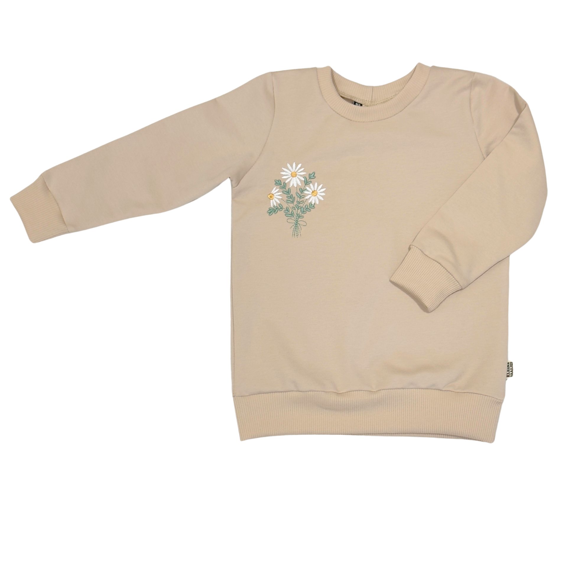 Uni geborduurde sweater voor meisjes van zeer zacht sweat katoen in de kleur beige met een lief bosje madeliefjes erop geborduurd.