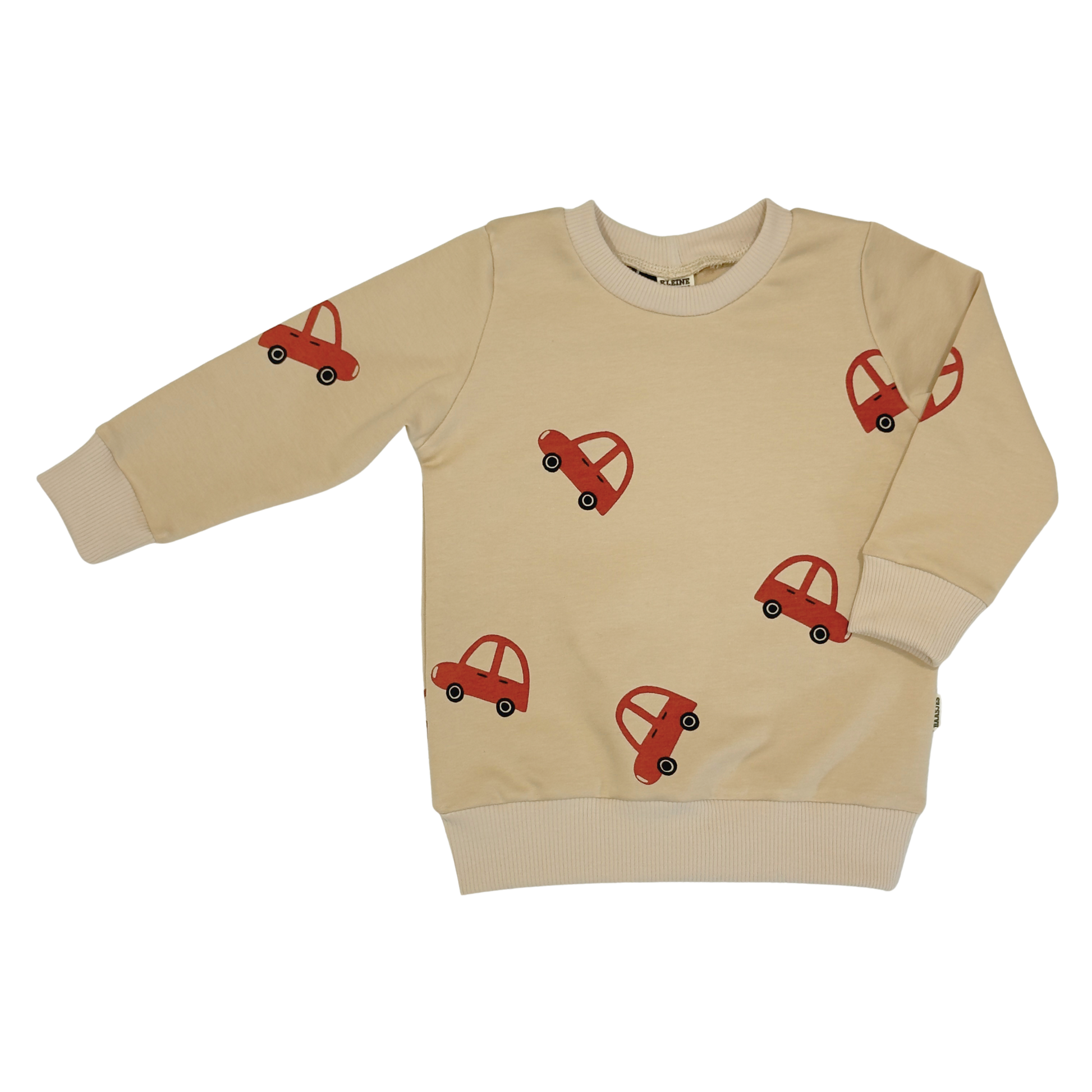 Mooie sweater van heel zacht sweat katoen in de kleur beige met een print van auto's in de kleur roest bruin.