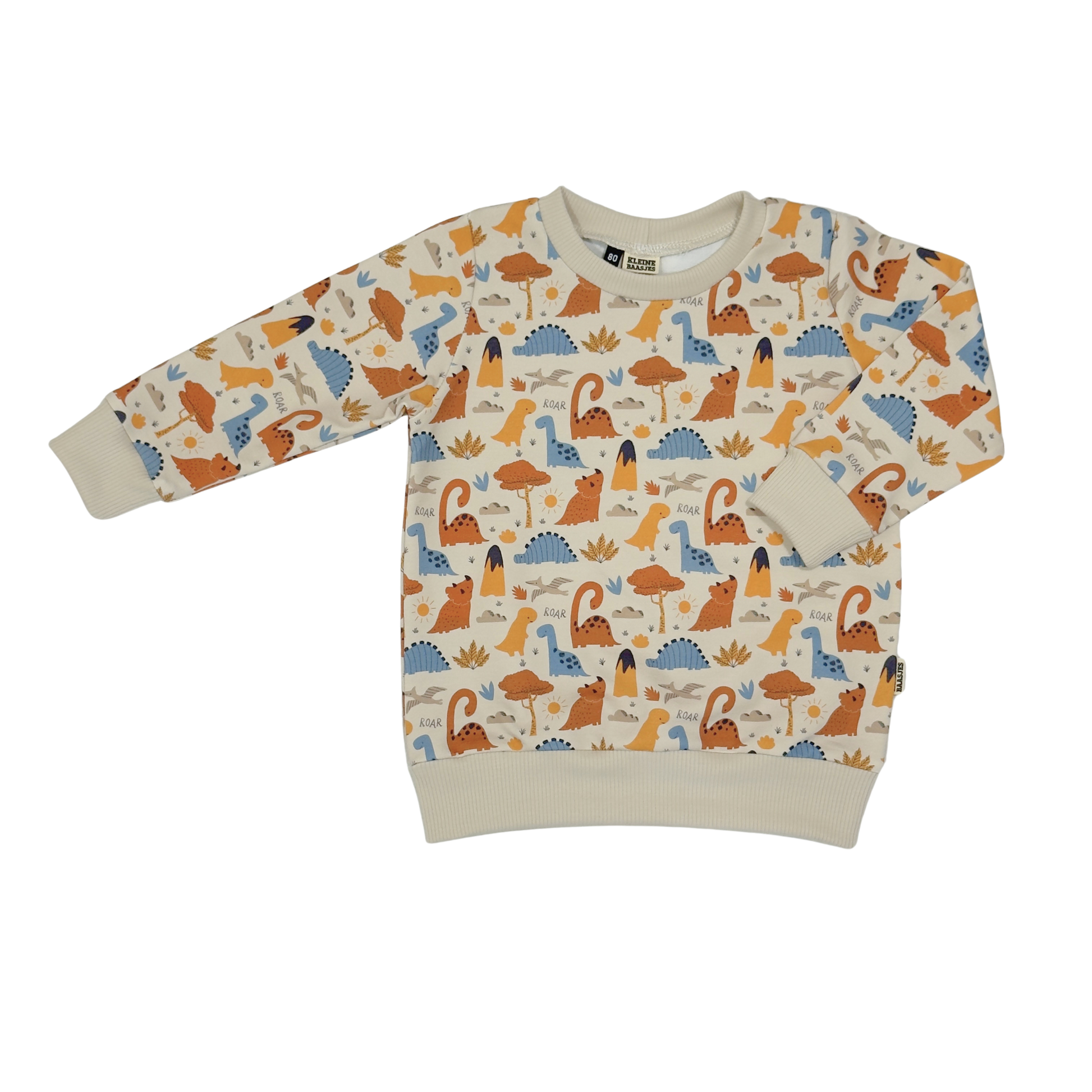 Stoere sweater van zacht sweat katoen in de kleur creme met een print van leuke dinosaurussen in de kleuren blauw, bruin en okergeel. De rekbare boorden zijn van zacht ribjersey in de kleur naturel creme.