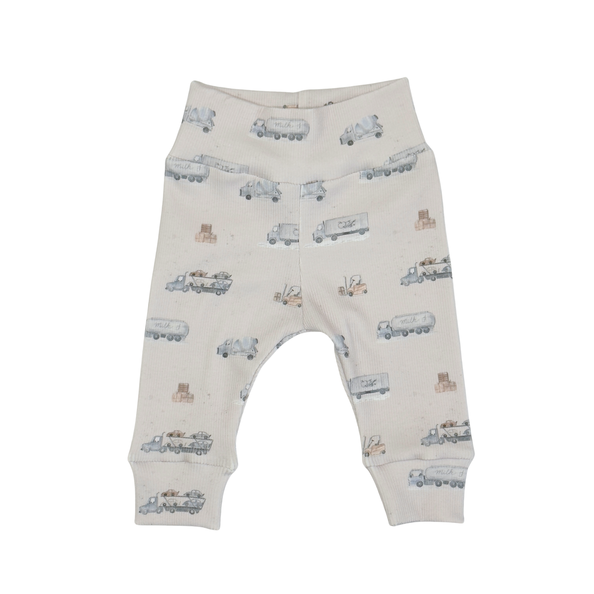 Fijn newborn broekje voor jongens van een zachte rib jersey stof. Het baby broekje is licht grijs van kleur met een print van melk trucks in de kleuren blauw en beige.