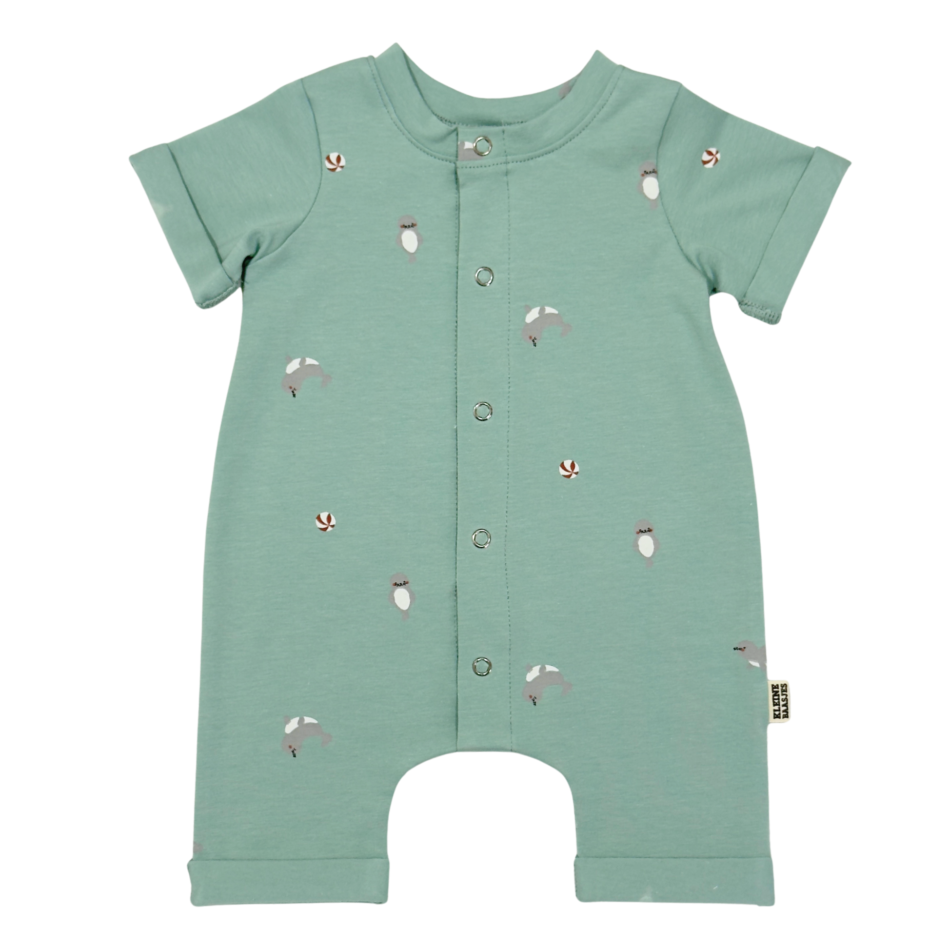 Mooie zomer jumpsuit in een zachte jersey met een printje van zeehondjes met een strandbal in de kleur zee groen.