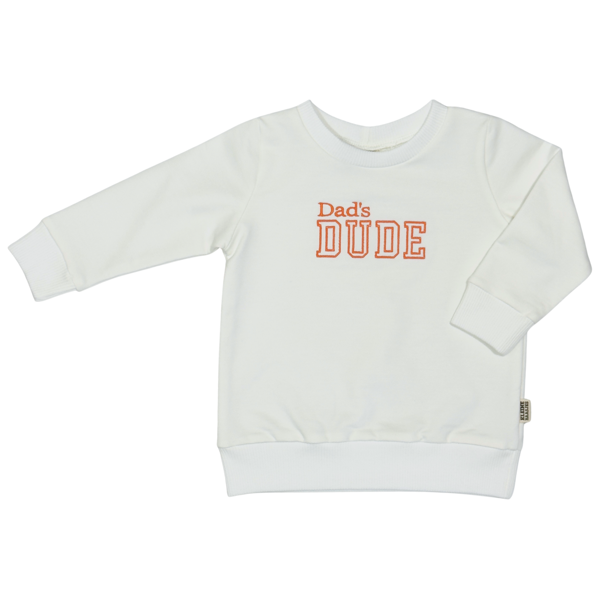 Uni geborduurde sweater voor jongens van zeer zacht sweat katoen in de kleur wit met Dad's Dude in blauwe of oranje letters erop geborduurd.