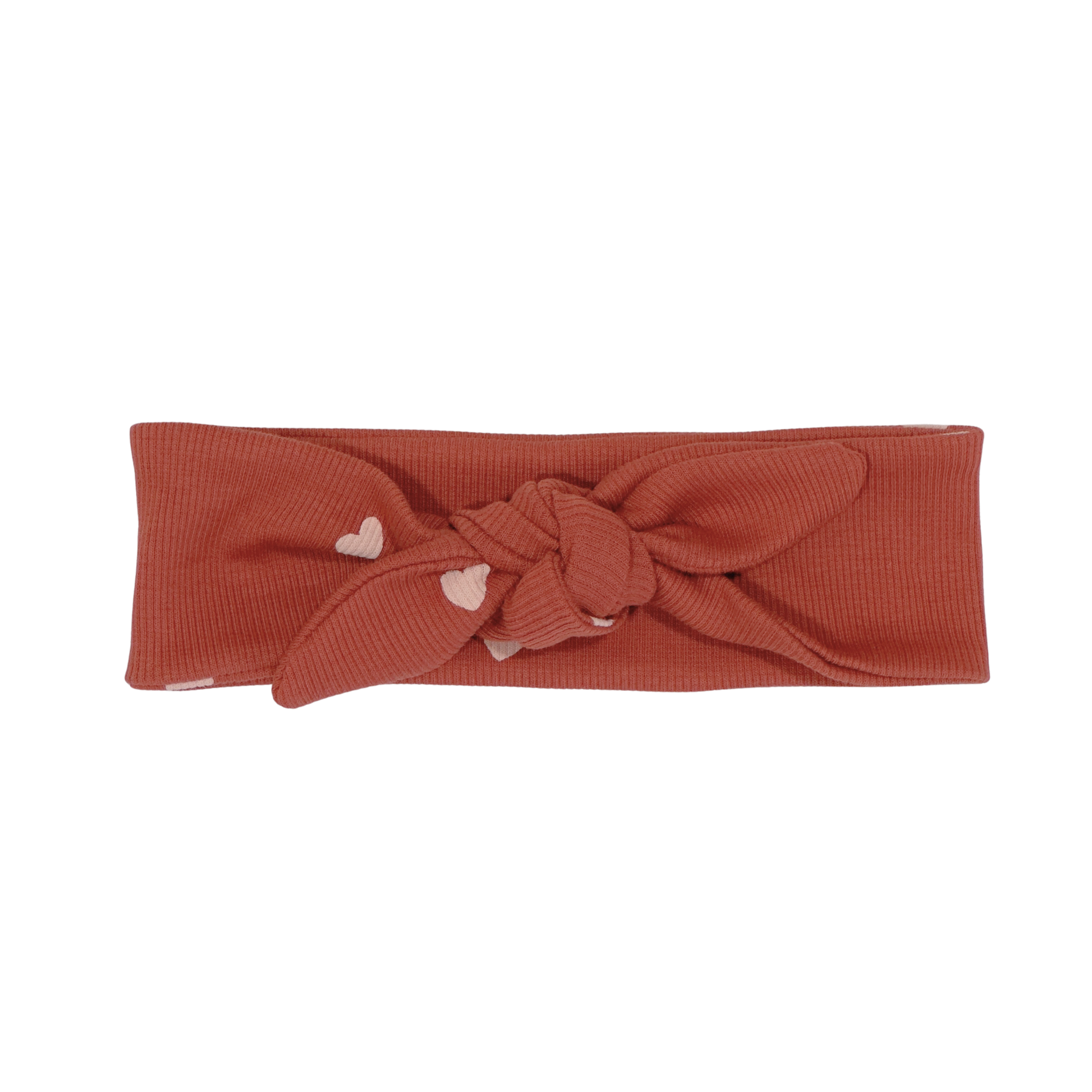 Geknoopte haarband met lieve roze hartjes in de kleur roest bruin. Draag deze haarband in combinatie met een jumpsuit, jurkje of broekje van dezelfde of bijpassende print/kleur om de look van je kleintje helemaal af te maken!