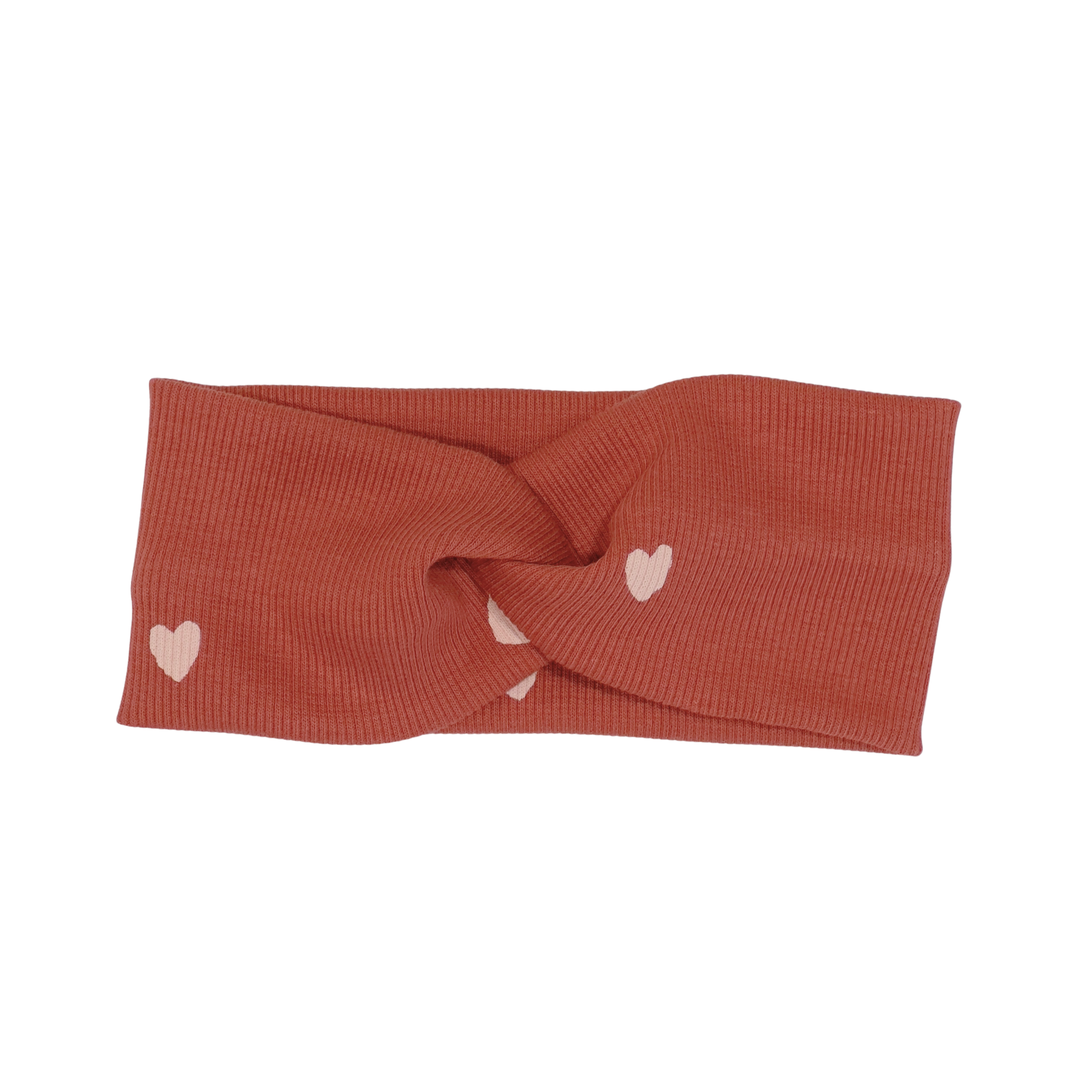 Getwiste haarband in een mooie ribstof met een printje van hartjes in de kleur roze en roest bruin. Draag deze haarband in combinatie met een jumpsuit, jurkje of broekje van dezelfde of bijpassende print/kleur om de look van je kleintje helemaal af te maken!